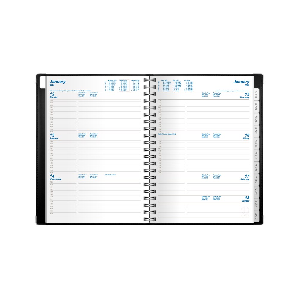 • Double wire binding. Lay flat opening. Ribbon marker. Tabs. Translucent pocket.